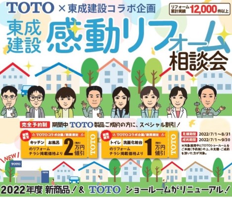 2022年7月5日令和4年 感動リフォーム相談会 投稿者名 : 東成建設株式会社/ Under : イベント, リフォームチラシ 感動リフォーム相談会 TOTO製品をご成約の方にスペシャル割引!! 詳しくは折込チラシをご覧ください。